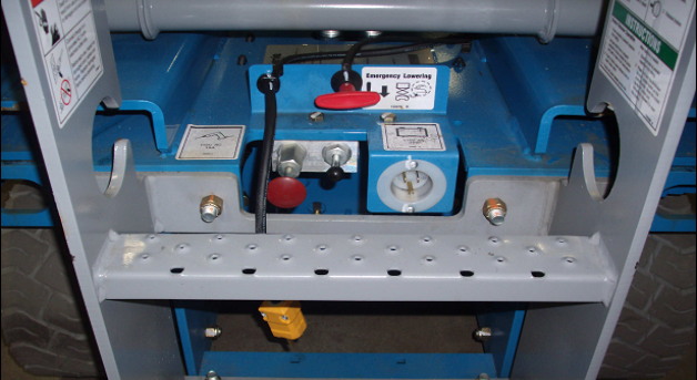 緊急下降系統(tǒng):在緊急狀況下,操作人員只需簡(jiǎn)單的拉動(dòng)紅色的T型把手,將平臺(tái)下降到收藏位置;無工具剎車釋放:簡(jiǎn)單的按下黑色的球型把手同時(shí)往復(fù)按壓紅色球形把手,釋放剎車即可解決。