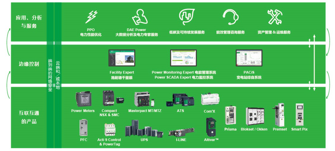 施耐德電氣EcoStruxure配電利用在互聯(lián)互通的產(chǎn)品,邊緣控制,以及應用、分析和服務三個層面的創(chuàng)新,形成從連接、收集到分析、行動的閉環(huán)智能配電新架構(gòu),覆蓋數(shù)據(jù)中心建設和運行所有電力領(lǐng)域和管理鏈各個環(huán)節(jié),通過開放式集成、實時操作分析以及更高級別的網(wǎng)絡安全,幫助用戶充分利用智能化和數(shù)字化的新機遇,實現(xiàn)更安全可靠、高效、可持續(xù)性和互聯(lián)互通。