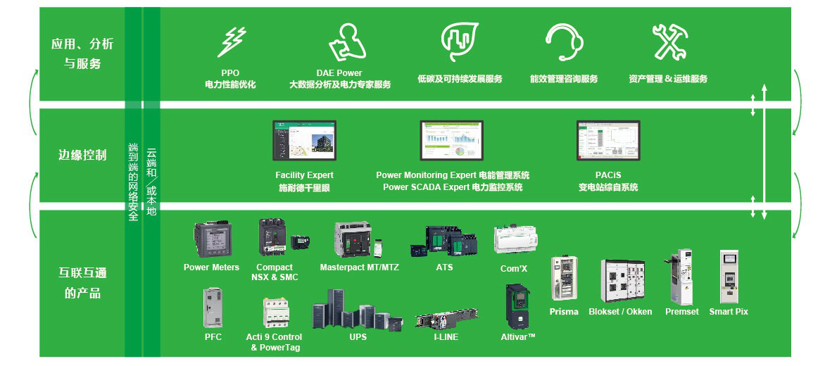 如今,能源世界正在呈現(xiàn)更分散化、低碳化、數(shù)字化和用電量持續(xù)增長的形勢。施耐德電氣于2017年發(fā)布全新一代EcoStruxureTM系統(tǒng)架構(gòu),分別面向樓宇、基礎(chǔ)設(shè)施、工業(yè)和數(shù)據(jù)中心市場提供開放和可互操作的系統(tǒng)架構(gòu),推動(dòng)從互聯(lián)互通的產(chǎn)品到邊緣控制,再到應(yīng)用、分析與服務(wù)三個(gè)層面的全面創(chuàng)新。