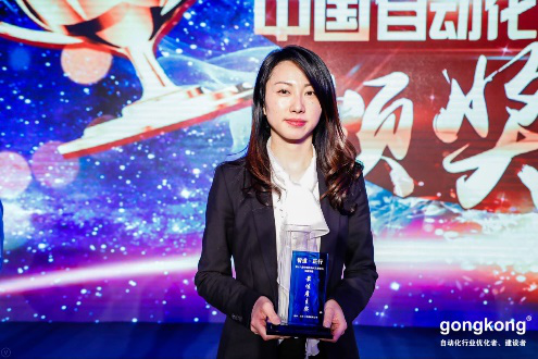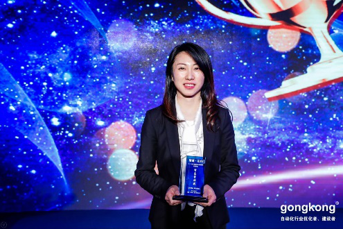 文字說明: 人力資源經(jīng)理陳雯代表馬艾倫博士以及浩亭中國在北京舉辦的中國自動化及智能制造服務(wù)年會上接受“智惠管理獎”和“最佳雇主獎”。