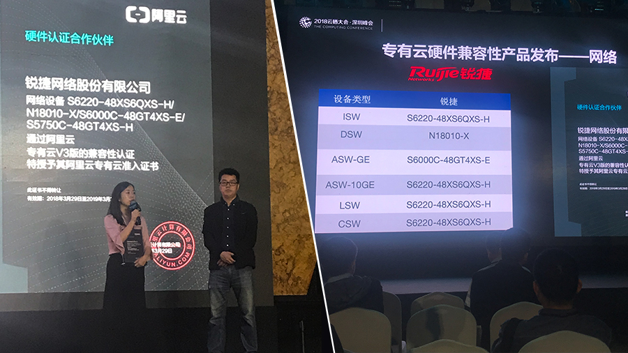 圖:銳捷網絡和阿里云專有云硬件兼容性認證授牌現(xiàn)場