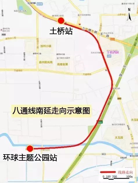 根據(jù)規(guī)劃,八通線將從現(xiàn)在的東端終點(diǎn)土橋站向南延伸4.5公里,到正在建設(shè)中的環(huán)球主題公園。