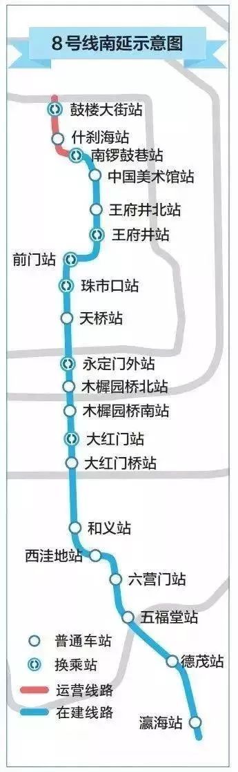 據(jù)了解, 8號(hào)線三期、四期的規(guī)劃為,北起中國(guó)美術(shù)館站,南至瀛海站,共計(jì)16座車站,其中有5座換乘站。