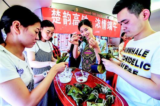 圖為:6月15日,在武漢開往深圳北的G77次高鐵列車上,武漢客運段工作人員與旅客互動,開展“楚韻高鐵、濃情端午”活動。圖為乘務(wù)員與旅客一起包粽子。(湖北日報全媒記者 梅濤通訊員 蘇杭 攝)