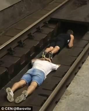 視頻顯示,兩個(gè)穿著短褲和T恤的年輕男子突然從站臺(tái)上跳下來,躺在鐵軌間。