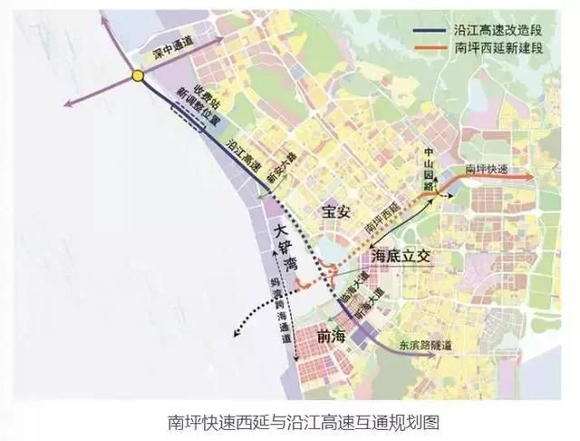 可以看出,深圳是準備讓“南坪快速”向西延伸,在前海最核心的地段(地下),對接“沿江高速”(從圖片上看,沿江高速這段路將下沉入海,而目前是高架)。然后,“南坪快速”繼續(xù)向西,跟“媽灣跨海通道”對接后,連接珠海。