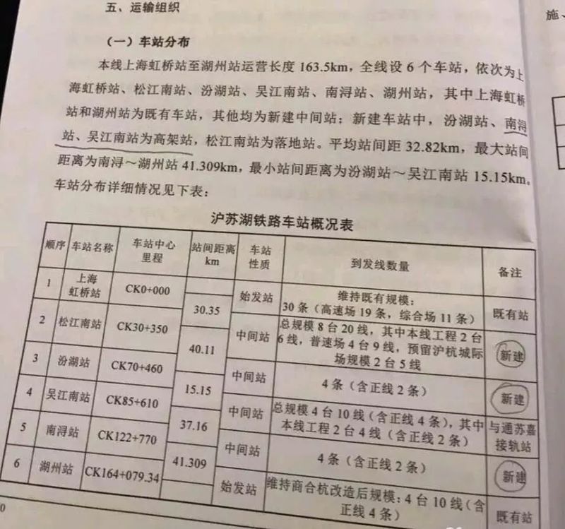 ▲滬蘇湖高鐵線路圖 新建車(chē)站中 汾湖站、吳江南站、南潯站為高架站 平均站間距32.82km 最大站間距離為南潯~湖州站41.309km 最小站間距離為汾湖站~吳江南站15.15km