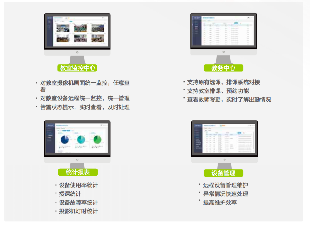 教室設(shè)備多、連線復(fù)雜、維護(hù)性低,缺少數(shù)據(jù)化精確管控。教室分散,無(wú)法實(shí)現(xiàn)可視化集中管理。