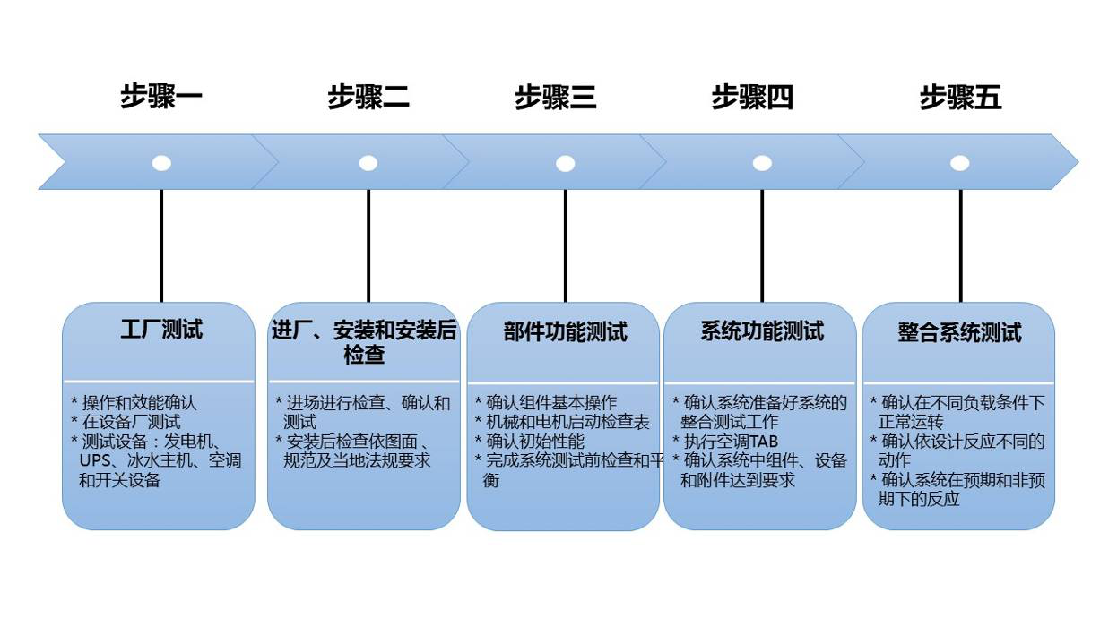 性能驗證是申請綠色數(shù)據(jù)中心的必要條件,在ASHRAE Guideline中,對性能驗證定義為“建筑物系統(tǒng)功能之設(shè)計、試車、運(yùn)轉(zhuǎn)之過程,以使系統(tǒng)能運(yùn)轉(zhuǎn)于保持其設(shè)計原意為目的”。性能驗證程序的實施,將使業(yè)主、設(shè)計單位、施工單位互相整合,在計劃階段、設(shè)計時間、工程施工階段、竣工系統(tǒng)性能測試階段及營運(yùn)維護(hù)管理,均須依照業(yè)主項目需求(Owner’s Project Requirements, OPR)與設(shè)計基準(zhǔn)(Basic of Design),執(zhí)行試運(yùn)行能使數(shù)據(jù)中心的能源使用效率提升。