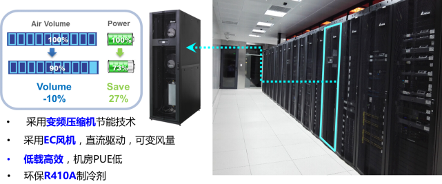 數(shù)據(jù)中心的IT設(shè)備建置往往需要依據(jù)實際的營運(yùn)逐步增加,再加上空調(diào)設(shè)備皆會設(shè)置備援,此時可變轉(zhuǎn)速的空調(diào)設(shè)備即可靈活彈性的運(yùn)用。在中低負(fù)載時,列間空調(diào)多臺同時運(yùn)轉(zhuǎn)下,此時高節(jié)能EC風(fēng)扇降低轉(zhuǎn)速及壓縮機(jī)亦進(jìn)行變頻的流量控制,依據(jù)實際工作負(fù)載調(diào)整轉(zhuǎn)速,減少電力損耗(如:風(fēng)量下載10%,用電量可下降27%),可達(dá)到低負(fù)載高效率的運(yùn)轉(zhuǎn)。