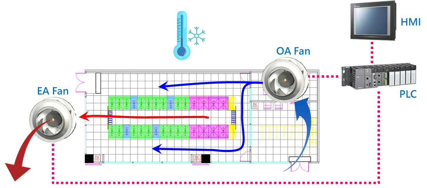 通過吳江當(dāng)?shù)貧夂蛸Y料的分析,發(fā)現(xiàn)吳江地區(qū)每年有約一半的時間可引進(jìn)新風(fēng)做自然冷卻,如圖九所示。善用如此優(yōu)越的自然環(huán)境資源,將可大大降低能源的使用。利用新風(fēng)風(fēng)機(jī)及排風(fēng)風(fēng)機(jī)搭配PLC進(jìn)行新風(fēng)自然冷卻,如圖十所示,新風(fēng)引入的判斷依據(jù)室外溫度、相對濕度及焓值與室內(nèi)所需條件進(jìn)行比較,當(dāng)室外條件皆低于設(shè)定值時即全載引進(jìn)新風(fēng),此時可關(guān)閉列間空調(diào)系統(tǒng),可達(dá)到最低能源使用。