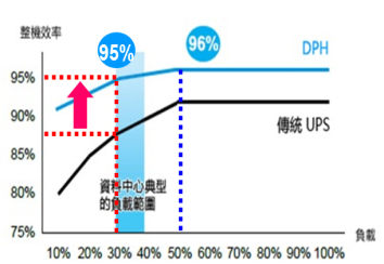 圖十一 高效模塊式UPS(以臺達(dá)DPH系列為例)與傳統(tǒng)UPS效率比較