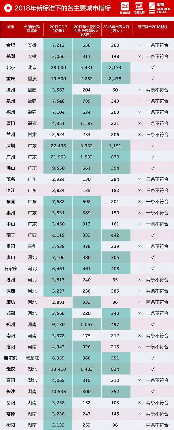 根據(jù)住建部2018年1月5日發(fā)布的《2016年城市建設(shè)統(tǒng)計(jì)年鑒》中2016年市區(qū)人口數(shù)據(jù)(目前暫時(shí)無(wú)法獲取完整2017年的市區(qū)人口數(shù)據(jù),2016年數(shù)據(jù)已經(jīng)為最新)、各城市2017年國(guó)民經(jīng)濟(jì)和社會(huì)發(fā)展統(tǒng)計(jì)公報(bào)中GDP和一般公共財(cái)政預(yù)算收入,43個(gè)已獲地鐵建設(shè)批復(fù)的城市,按照新標(biāo)準(zhǔn)有多個(gè)城市指標(biāo)不再符合要求,這些城市申請(qǐng)修建新的地鐵線路將遭遇夢(mèng)碎。