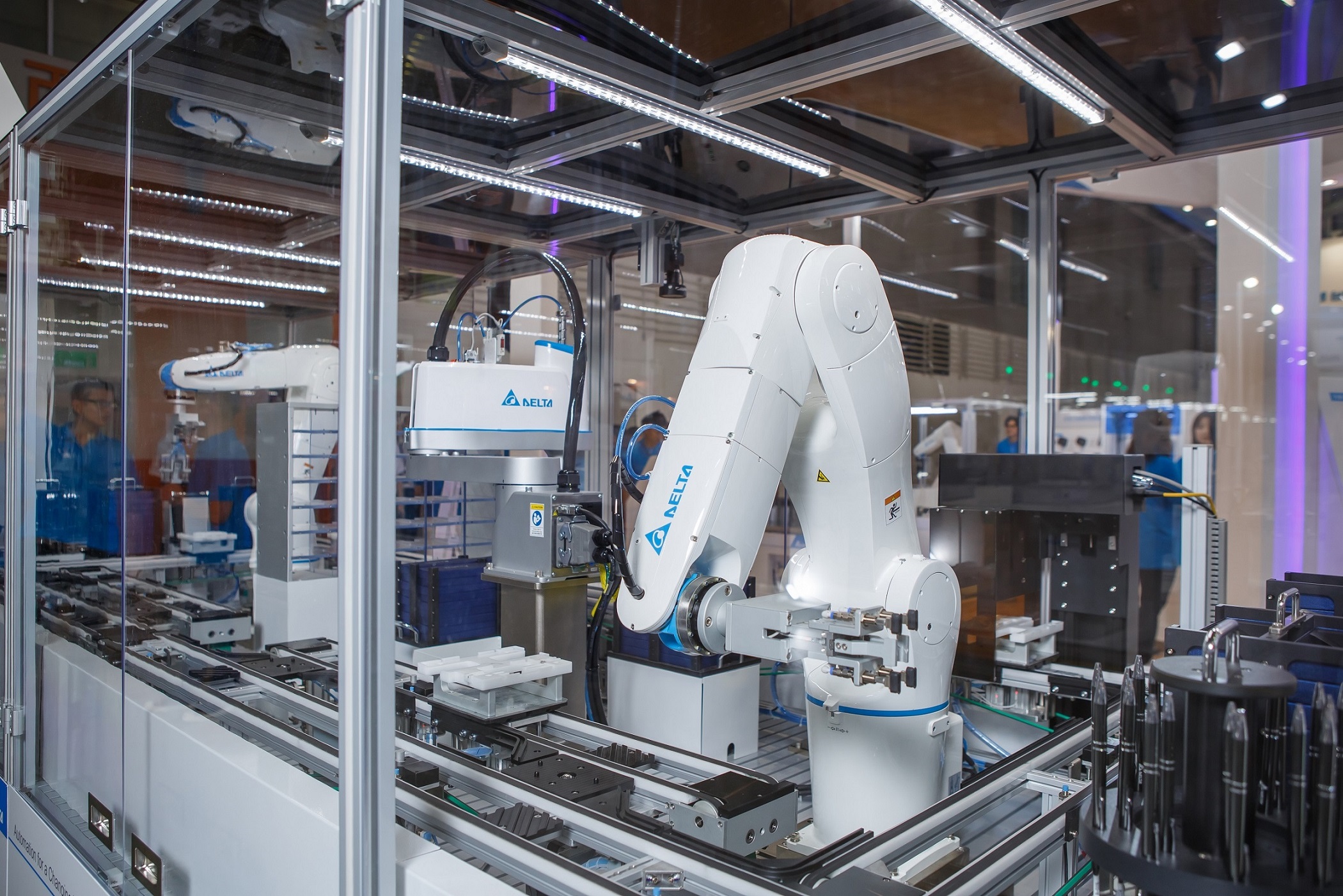 在智能設備方面,臺達于展會現(xiàn)場也推出電子伺服壓床、鎖螺絲機器人及3D視覺點焊三大先進、高階制程設備方案。臺達結合電子伺服壓床和鎖螺絲機器人,打造全自動、智能的工件鎖附和沖壓設備,串聯(lián)控制、信息管理系統(tǒng),實時信息可上傳資料庫和管理平臺,實現(xiàn)機聯(lián)網和可視化管理;3D視覺點焊解決方案以最新的3D視覺檢測技術搭配虛實整合系統(tǒng),克服精密電子業(yè)中困難度高的PCB板自動焊錫制程,大幅提高加工精準度和質量。
