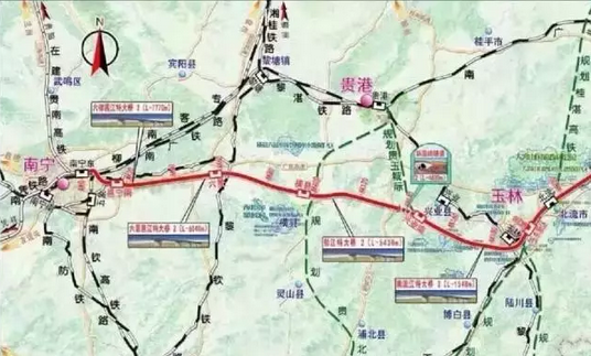 新建南深高鐵南寧至玉林段位于廣西壯族自治區(qū)境內(nèi),連接北部灣城市群與桂東南城鎮(zhèn)群,線路西起自治區(qū)省會(huì)南寧市,向東經(jīng)南寧市邕寧區(qū)、六景工業(yè)園至橫縣,行經(jīng)玉林市興業(yè)縣、福綿區(qū)至本線終點(diǎn)玉林市,線路長(zhǎng)度210.04千米,全線共設(shè)車(chē)站7座。速度標(biāo)準(zhǔn)為250公里/小時(shí)。南寧至玉林城際鐵路,計(jì)劃南寧東站引出,從城市南側(cè)引入玉林北站。