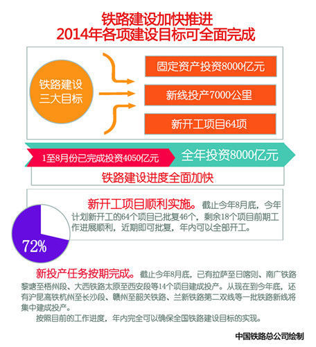這位負責人表示,按照國務院關于進一步加快鐵路建設的部署要求,2014年全國鐵路建設有三大目標,即全國鐵路固定資產(chǎn)投資8000億元、新線投產(chǎn)7000公里、新開工項目64項。面對這樣的繁重任務,中國鐵路總公司充分認識加快鐵路建設對穩(wěn)增長、調結構所起到的重要拉動作用,堅持以改革為動力,充分發(fā)揮體制機制優(yōu)勢,采取強有力措施,全力以赴推進鐵路建設,形成了非常好的建設局面。