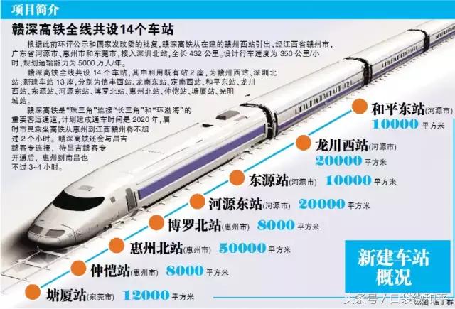 贛深高鐵設計時速350公里,線路全長約432公里,其中江西境內約133.9公里。贛深高鐵計劃建設工期48個月。建成后,和平到深圳,將由現(xiàn)在的時間壓縮到不到一個鐘頭。