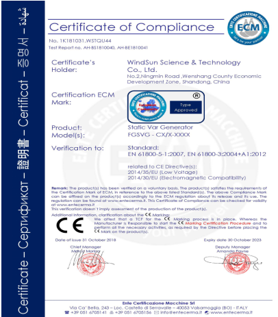 近日獲悉,新風(fēng)光電子科技股份有限公司生產(chǎn)的FGSVG系列高壓動(dòng)態(tài)無功補(bǔ)償裝置產(chǎn)品通過歐盟安全準(zhǔn)入認(rèn)證驗(yàn)收,并獲得CE認(rèn)證證書。