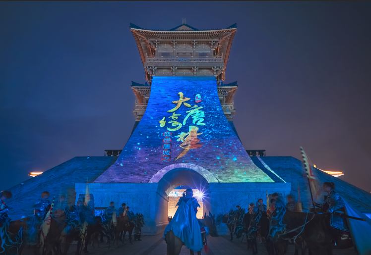 而在古城襄陽(yáng),唐城影視基地內(nèi),耗資2.5億的《盛世唐城之大唐倚夢(mèng)》,由近400名專(zhuān)業(yè)演員依托40萬(wàn)平方米仿唐建筑群為背景的大型嵌入行進(jìn)式全景秀每晚上演。作為《盛世唐城之大唐倚夢(mèng)》的主要影像設(shè)備,Vivitek(麗訊)共采用了38臺(tái)亮度為18,000 流明的激光工程投影機(jī)DU9800Z,分布在花萼樓、虹橋、朱雀門(mén)、德勝門(mén)等著名長(zhǎng)安城景點(diǎn),其中花萼樓共使用12臺(tái)Vivitek(麗訊)DU9800Z激光工程投影機(jī),虹橋、朱雀門(mén)和德勝門(mén)則分別使用了2臺(tái)、20臺(tái)和4臺(tái),通過(guò)拼接、融合的方式投射出震撼清晰的3D影像,完美詮釋了裸眼建筑3D投影的震撼效果。