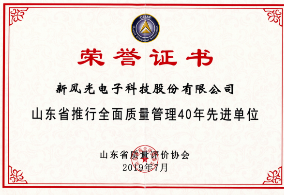 近日獲悉,山東省質(zhì)量評價協(xié)會公告了對山東省推行全面質(zhì)量管理40年功勛人物及卓越組織名單,新風(fēng)光電子科技股份有限公司位列其中,被評為“山東省推行全面質(zhì)量管理40年先進(jìn)單位”。此份殊榮是對新風(fēng)光實施“興在質(zhì)量,敗在服務(wù)”質(zhì)量強(qiáng)企戰(zhàn)略的高度認(rèn)可。