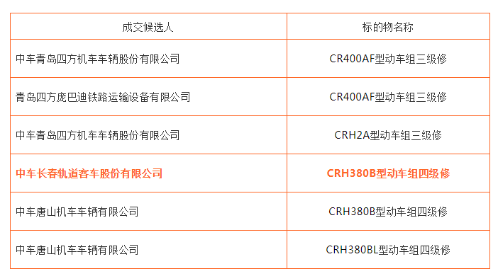 第一中標(biāo)候選人:中車長(zhǎng)春軌道客車股份有限公司