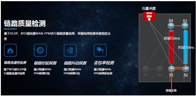 銳捷IO-WAN可對(duì)全網(wǎng)的業(yè)務(wù)情況進(jìn)行實(shí)時(shí)的監(jiān)控、展示,同時(shí)能夠快速的對(duì)全網(wǎng)的配置進(jìn)行動(dòng)態(tài)調(diào)整,并提供了廣域網(wǎng)加速應(yīng)用。例如:通過(guò)控制器智能編排,實(shí)現(xiàn)了業(yè)務(wù)到哪里,邏輯網(wǎng)絡(luò)就到哪里的目標(biāo)。其優(yōu)勢(shì)特性還體現(xiàn)在能夠根據(jù)用戶的帶寬需求和網(wǎng)絡(luò)的實(shí)時(shí)狀況,動(dòng)態(tài)的實(shí)現(xiàn)骨干網(wǎng)流量的全局路徑優(yōu)化,利用多維度智能檢測(cè),對(duì)鏈路中斷或異常作出快速反應(yīng)并重新規(guī)劃路徑。此外,憑借應(yīng)用級(jí)智能選路調(diào)度、自適應(yīng)糾錯(cuò)、智能動(dòng)態(tài)鏈路負(fù)載均衡,隨時(shí)保障核心業(yè)務(wù)都有“足夠”的帶寬,將應(yīng)用體驗(yàn)推向更高點(diǎn)。