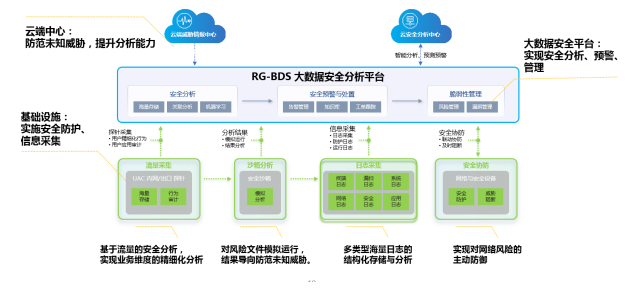 高速公路監(jiān)控網(wǎng)絡(luò)中部署了大量的安全設(shè)備、擁有海量安全日志,方案中提供了銳捷RG-BDS大數(shù)據(jù)安全分析平臺,利用態(tài)勢感知與威脅情報分析技術(shù),解決了日志分析人力成本過高、安全技術(shù)門檻過高的“雙高”難題。同時利用“日志采集+流量分析”的模式,對網(wǎng)絡(luò)終端和流量中的異常安全事件進行解析,包括攻擊流量特征、威脅文件傳輸、勒索病毒感染等,然后把結(jié)果實時同步到上端云端中心,進行深度關(guān)聯(lián)分析及問題定位呈現(xiàn)。