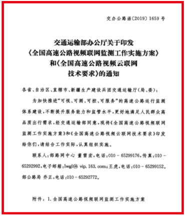 為加快推進可視、可測、可控、可服務(wù)的高速公路運行監(jiān)測體系建設(shè),交通運輸部辦公廳在去年發(fā)布《全國高速公路視頻聯(lián)網(wǎng)監(jiān)測工作實施方案》和《全國高速公路視頻云聯(lián)網(wǎng)技術(shù)要求》。要求到2020年底,基本建立全國高速公路視頻聯(lián)網(wǎng)監(jiān)測管理機制和制度標準體系,建設(shè)部級視頻云平臺并全國聯(lián)網(wǎng)運行。