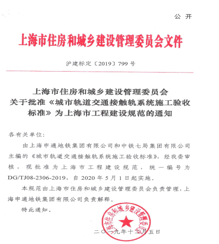 近日,《城市軌道交通接觸軌系統(tǒng)施工驗(yàn)收標(biāo)準(zhǔn)》(DG/TJ08-2306-2019)(以下簡(jiǎn)稱《標(biāo)準(zhǔn)》)正式由上海市住房和城鄉(xiāng)建設(shè)管理委員會(huì)批準(zhǔn),于2020年5月1日起實(shí)施。這是繼中鐵七局集團(tuán)有限公司主編的江蘇省《城市軌道交通接觸網(wǎng)系統(tǒng)工程質(zhì)量驗(yàn)收規(guī)范》頒布實(shí)施之后,華東地區(qū)又一部地方建設(shè)標(biāo)準(zhǔn)被批準(zhǔn)實(shí)施。