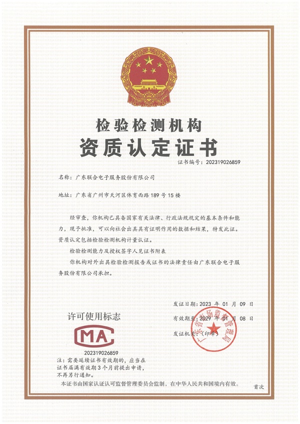 2023年1月,聯(lián)合電服公司通過廣東省市場監(jiān)督管理局行政許可,獲國家檢驗檢測機(jī)構(gòu)資質(zhì)認(rèn)定證書,成為國內(nèi)首家獲得CMA認(rèn)證的省級收費(fèi)公路聯(lián)網(wǎng)結(jié)算管理中心。