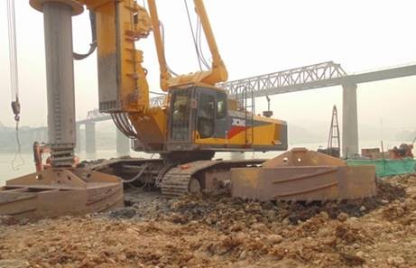 新白沙沱長江大橋橋梁設(shè)計(jì)包括3.2m孔徑的32根樁,樁深60m左右,直徑很大,在國內(nèi)尚屬罕見?;A(chǔ)公司向客戶提供了扭矩最大可達(dá)390千牛/米的徐工XRS1050旋挖鉆機(jī),并結(jié)合當(dāng)?shù)氐刭|(zhì)情況,因地制宜提出施工工法:盡量減少鉆進(jìn)阻力,雙管齊下,以破碎面積較小的筒鉆進(jìn)行鉆進(jìn)為主,雙底板撈砂斗清理鉆渣為輔,最終完成了3.2m大直徑樁孔的施工鉆進(jìn),并將施工時(shí)間由原來的5天一根樁提高到3天一根樁,贏得了客戶的贊譽(yù)。