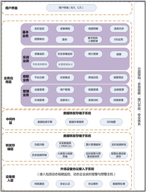 業(yè)務(wù)應(yīng)用層:是基于中間件層之上進(jìn)行的各種業(yè)務(wù)處理、運算和管理服務(wù)層,包括實時監(jiān)控、錄像追蹤、報警、信息導(dǎo)入、GIS應(yīng)用、查詢統(tǒng)計、報警聯(lián)動、系統(tǒng)對時等業(yè)務(wù)處理功能,同時提供豐富的系統(tǒng)配置管理功能。