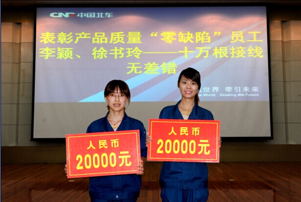 9月4日,中國北車唐車公司董事長侯志剛將2萬元獎(jiǎng)金,分別交到了總裝配一廠接線女工李穎、徐書玲手中,作為她們創(chuàng)造了連續(xù)接線10萬根以上無差錯(cuò)記錄的獎(jiǎng)勵(lì)。唐車公司對(duì)李穎、徐書玲長年不懈的堅(jiān)持,時(shí)刻把質(zhì)量放在最高位置的工作態(tài)度予以表彰,并以此激勵(lì)全體“中國第一代高鐵工人”繼續(xù)在各自的工作崗位上,不斷追求精細(xì)、創(chuàng)造完美。