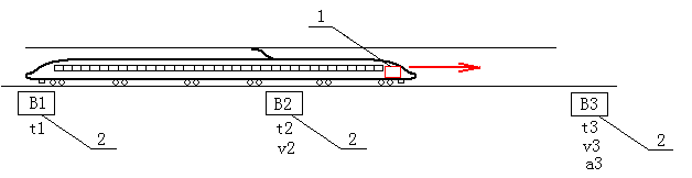 圖1中,標號B1、B2、B3分別為列車前進方向上安裝在二軌道中間的、按序分布的三個應答器(2),列車前行時將依此經(jīng)過B1、B2、B3。列車查詢器(1)經(jīng)過應答器的時間點分別為t1、t2、t3。同時,由軌道設計安裝所決定的B1與B2間的距離為(B2-B1),同樣可得B2與B3間的距離為(B3-B2)。