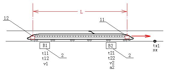 圖2為雙發(fā)查詢器運動學計程原理圖。圖中,(11)和(12)分別為車頭查詢器和車尾查詢器。