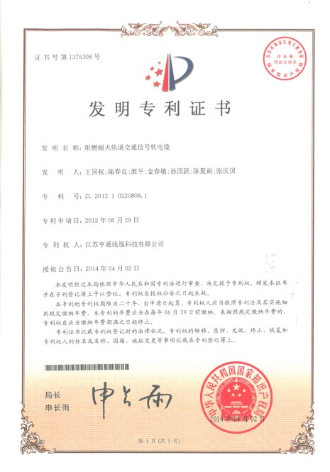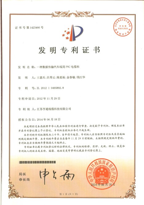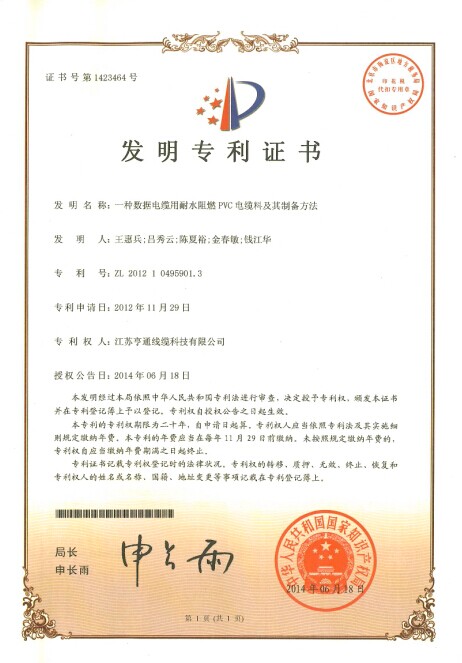 此證書(shū)是亨通線纜繼“一種數(shù)據(jù)傳輸汽車(chē)線用PVC電纜料”、“一種數(shù)據(jù)電纜用耐水阻燃PVC電纜料及其制備方法”及“阻燃耐火軌道交通信號(hào)軟電纜”三項(xiàng)發(fā)明專(zhuān)利之后的又一項(xiàng)重要發(fā)明專(zhuān)利,也是2014年度的第四項(xiàng)發(fā)明專(zhuān)利。