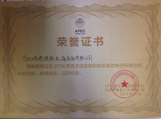 會議結(jié)束后,為表彰積極貢獻(xiàn)者,由“2014年亞太經(jīng)合組織會議北京市籌備工作領(lǐng)導(dǎo)小組”頒發(fā)了“APEC榮譽(yù)證書”予先控電源。