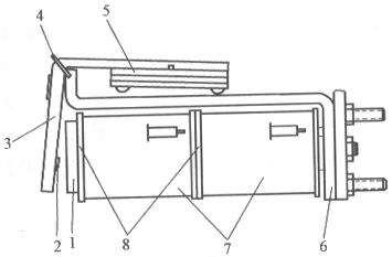 1—鐵心;2—止片;3—銜鐵;4—鋼絲卡;5—重錘片;6—軛鐵;7—前后線圈;8—前后線圈架。