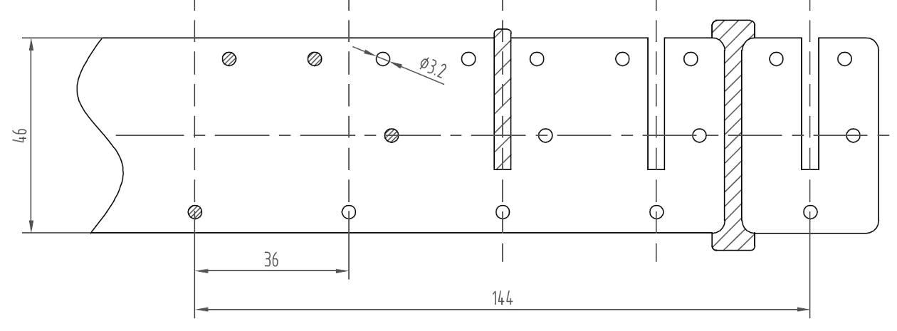 零件沖壓的工藝特性:從沖零件的安裝孔開始到最后切斷零件成形,為減少工位中步距誤差,對(duì)有相對(duì)位置的安裝孔在同一工位沖裁;考慮滾剪帶料的鐮刀彎現(xiàn)象、材料利用率等,對(duì)零件尺寸精度以及組裝后銜鐵組件周邊整齊度的影響;為便于維修、更換、調(diào)模、設(shè)備的臺(tái)面尺寸,盡可能減小模具的長(zhǎng)度。綜合以上各因素并按零件的工藝可行性設(shè)計(jì)出了合理的排樣,采用無(wú)搭邊,橫向排料方式,料寬46mm,步距36mm,材料的利用率提高了15﹪,年節(jié)約成本可達(dá)到15萬(wàn),排樣共設(shè)5工位,為了提高凹面鑲塊、卸料板和固定板的強(qiáng)度,在第4工位設(shè)置了空工位,有效工位4步。排樣圖如圖3所示,工位:①?zèng)_導(dǎo)正孔及重錘片疊鉚孔;②沖導(dǎo)正孔及重錘片疊鉚孔;③沖中間槽空步;④空工位;⑤切斷;