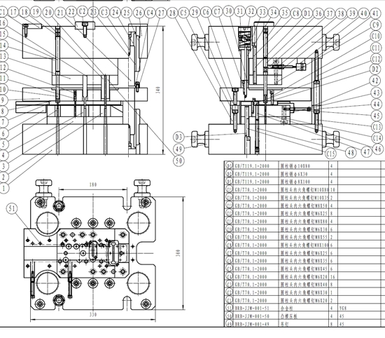 對(duì)于高速自動(dòng)送料沖壓級(jí)進(jìn)模而言,模具的導(dǎo)向精度要求比較高,同時(shí)由于采用無(wú)搭邊排樣設(shè)計(jì),給設(shè)計(jì)與制造模具帶來(lái)一定的難度。模具結(jié)構(gòu)如圖4所示,此模具工作臺(tái)面300×300mm,閉合高度340mm,模具沖速在120~300次/min,具有良好的剛度和精度、穩(wěn)定可靠的卸料和安全保護(hù)功能,各工藝零件和輔助零件都給定淬火硬度。
