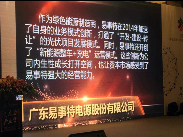 評委會認(rèn)為,作為全球綠色能源制造商,易事特在2014年加速了自身的業(yè)務(wù)模式創(chuàng)新,打通了“開發(fā)-建設(shè)-轉(zhuǎn)讓”的光伏項目發(fā)展模式。同時易事特還開創(chuàng)了“新能源整車+充電”運營模式,這些創(chuàng)新為公司內(nèi)生性成長打開空間,也讓資本市場感受到了易事特強大的經(jīng)營能力。