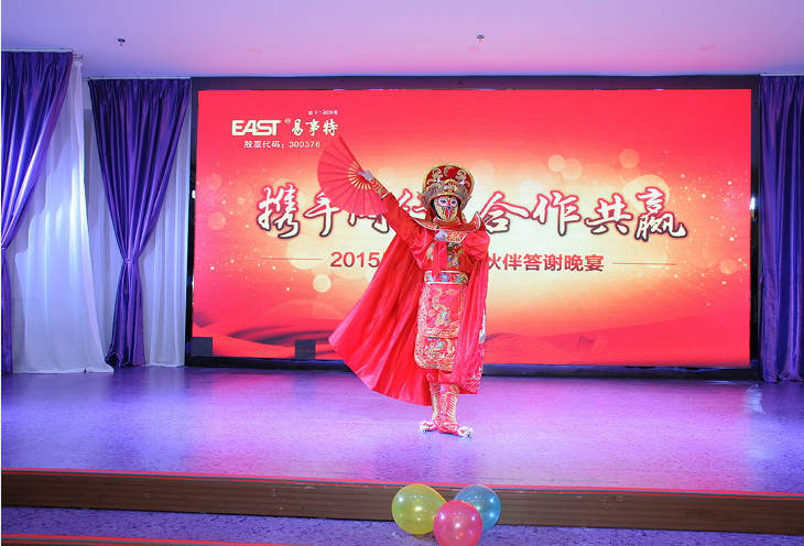 當(dāng)晚,公司舉行了隆重的合作伙伴答謝晚宴,易事特公司高層領(lǐng)導(dǎo)、2015年度勞動(dòng)模范及與會(huì)的供應(yīng)商朋友共聚一堂,共同欣賞由東莞市梨園戲劇社帶來的精彩黃梅戲、川劇變臉等戲曲節(jié)目。