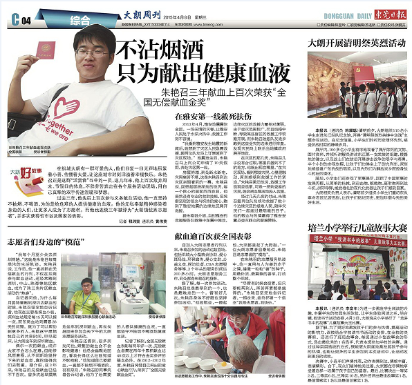參加工作后,他一直活躍在無償獻(xiàn)血的行列,不僅在東莞參與獻(xiàn)血活動(dòng),還經(jīng)常跑到深圳、中山、珠海等地區(qū)獻(xiàn)血,成為了珠三角片區(qū)獻(xiàn)血活動(dòng)的熟客。他不單單獻(xiàn)血,還獻(xiàn)血小板,因深圳血站規(guī)定每15天可以捐一次血小板,而東莞血站則需要28天的間隔。就為了可以拯救更多亟待救治的人,他寧愿犧牲自己的休息時(shí)間,經(jīng)常起早摸黑地坐車到深圳獻(xiàn)血,再匆匆趕回來參加當(dāng)天下午東莞志愿服務(wù)活動(dòng)。據(jù)不完全統(tǒng)計(jì),近3年以來,朱艷召的無償獻(xiàn)血已經(jīng)不下百次,累計(jì)獻(xiàn)血量達(dá)4萬亳升。