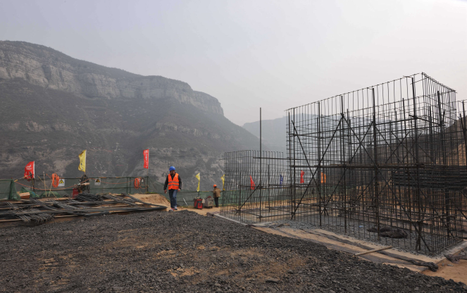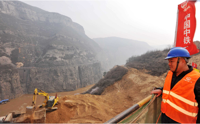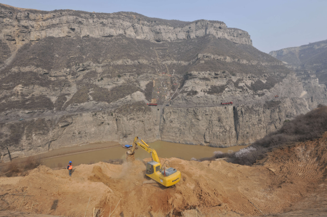 3月25日,中鐵一局陜西省韓城市龍門黃河大橋施工現(xiàn)場(chǎng)呈現(xiàn)一派施工大干的場(chǎng)面:奔騰的黃河從龍門奔涌向前,在黃河兩岸距河面100多米高的懸崖峭壁上,工人們正忙碌著用挖掘機(jī)修建施工平臺(tái)。