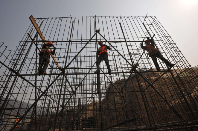 中鐵一局蒙華鐵路龍門大橋進(jìn)行鋼筋綁扎。牛榮健 攝