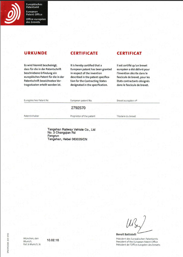 早在2012年10月22日,中車唐山公司就“排障吸能裝置及動車組頭車專利”向歐洲專利局提出PCT申請,經(jīng)歷了近4年的嚴格審查及答辯,于2016年2月10日正式通過審查,獲得授權,并在一個多月后收到證書。獲得該項專利,得益于中車唐山公司對產(chǎn)品技術的不斷創(chuàng)新和知識產(chǎn)權工作的高度重視。