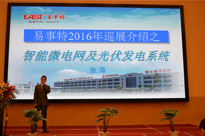 易事特研發(fā)中心張濤博士向與會嘉賓介紹易事特光伏發(fā)電系統(tǒng)的全系列產(chǎn)品及整體解決方案: