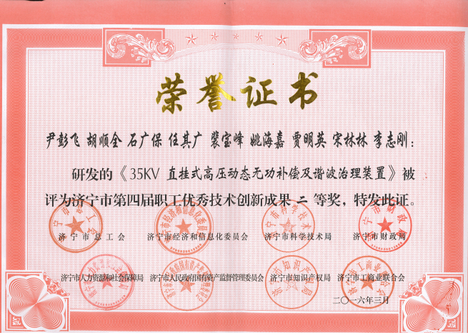 近日獲悉,在“濟寧市第四屆職工優(yōu)秀技術(shù)創(chuàng)新成果”評選活動中,新風光公司申報的《35kV直掛式高壓動態(tài)無功補償及諧波治理裝置》被評為“濟寧市職工優(yōu)秀技術(shù)創(chuàng)新成果”二等獎。