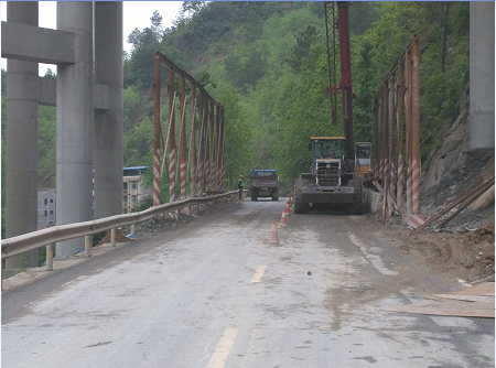 宏福村大橋下方跨國(guó)道區(qū)域路寬較為狹窄,平時(shí)剛好滿(mǎn)足兩輛車(chē)雙向行駛,而又由于施工條件受限,裝載機(jī)、吊車(chē)必須??吭贕318國(guó)道上,造成了該區(qū)域車(chē)輛只能單向通行。中交一公局華祥公司萬(wàn)利高速公路五分部采取多種安全保障措施,確保了臨時(shí)防護(hù)棚拆除工作安全完成。拆除前,該分部派2名安全員前往拆除區(qū)域,每邊安排1人指揮交通,一邊放行則另一邊將車(chē)輛攔住,保證該區(qū)域車(chē)輛單向順利通行,待需要封鎖國(guó)道時(shí),安全人員拉設(shè)警戒帶,設(shè)置警示標(biāo)牌,對(duì)國(guó)道進(jìn)行暫時(shí)封鎖。指揮人員指揮吊車(chē)、裝載機(jī)進(jìn)行拆除工作,并根據(jù)情況隨時(shí)與兩側(cè)安全員保持聯(lián)系,以便發(fā)生異常情況時(shí)可以及時(shí)防范,安全人員則確保在指揮人員發(fā)布放行指令前,嚴(yán)禁任何車(chē)輛和行人通行。待部分拆除工作完成后,指揮人員宣布放行,安全人員則解除封鎖,對(duì)國(guó)道車(chē)輛和行人放行,并幫助疏導(dǎo)交通。