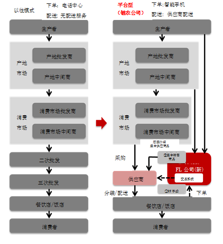 在食材采購的傳統(tǒng)模式下,食材需要經(jīng)過產(chǎn)地市場和消費(fèi)市場的多層中間渠道才能到達(dá)需求地,客戶一般通過電話下單或每天前往批發(fā)市場完成日常采購。而在Farmlink模式下,餐飲店負(fù)責(zé)人可以借助智能手機(jī),直接從Farmlink集采平臺訂購食材,并由專業(yè)配送公司提供運(yùn)輸服務(wù),所有交易均在線完成,便捷透明。對于大米、食用油等需求量巨大的食材,由于Farmlink公司能夠直接從生產(chǎn)者或一級產(chǎn)地市場集中采購,避開中間商,可以獲得更加低廉的價格,信息、交易、配送的一條龍服務(wù)將帶來所有采購環(huán)節(jié)的高效運(yùn)轉(zhuǎn)。